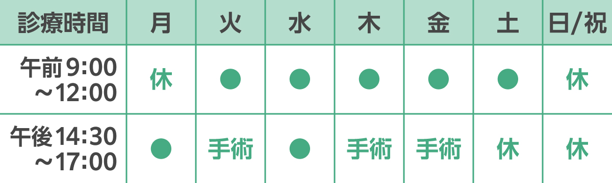 | 14:30〜17:00 | ◯ | 手術 | ◯ | 手術 | 手術 | 休 | 休 |